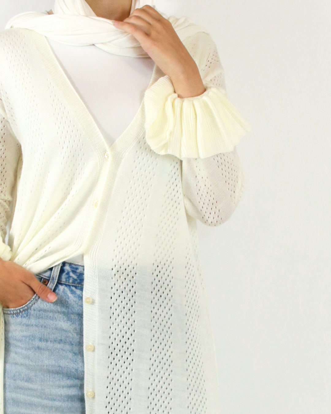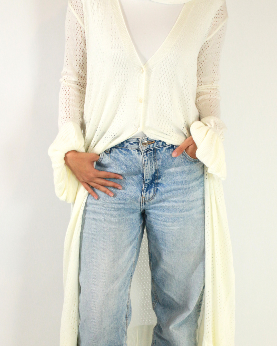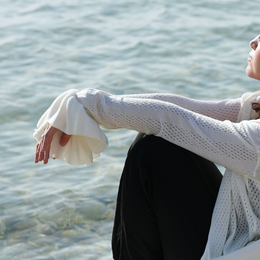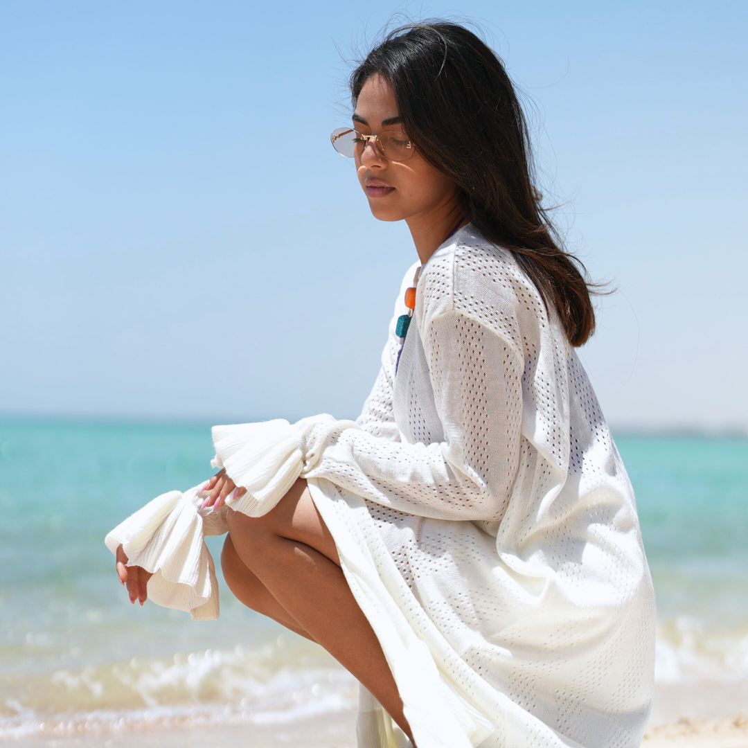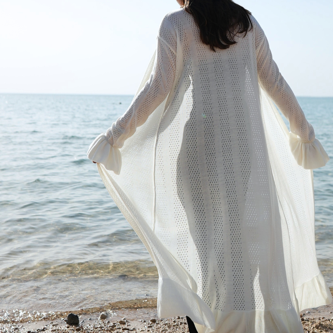 Its soft white-mocha hue gives it a timeless, neutral vibe that complements any look. Whether you're walking the shoreline or heading to brunch, this cardigan moves with you — flowing, breathable, and beautifully styled.